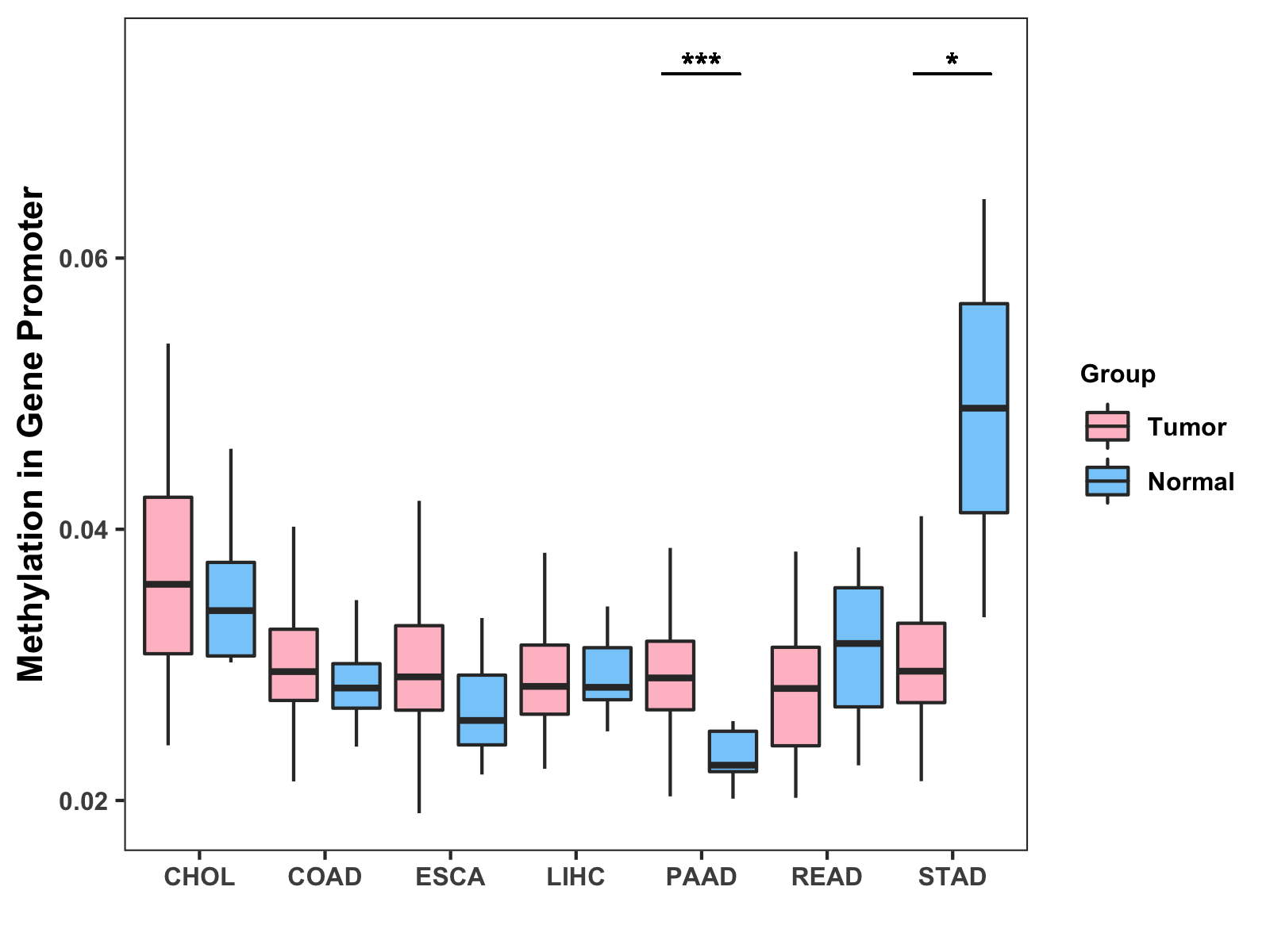Boxplot of All Gastrointestinal Cancer ( * : 0.01-0.05 , ** : 0.005-0.01 , *** : 0.0001-0.005 , **** : < 0.0001 ) |