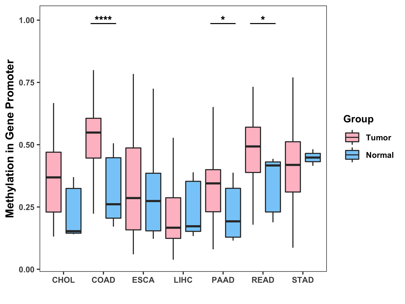 Boxplot of All Gastrointestinal Cancer ( * : 0.01-0.05 , ** : 0.005-0.01 , *** : 0.0001-0.005 , **** : < 0.0001 ) |