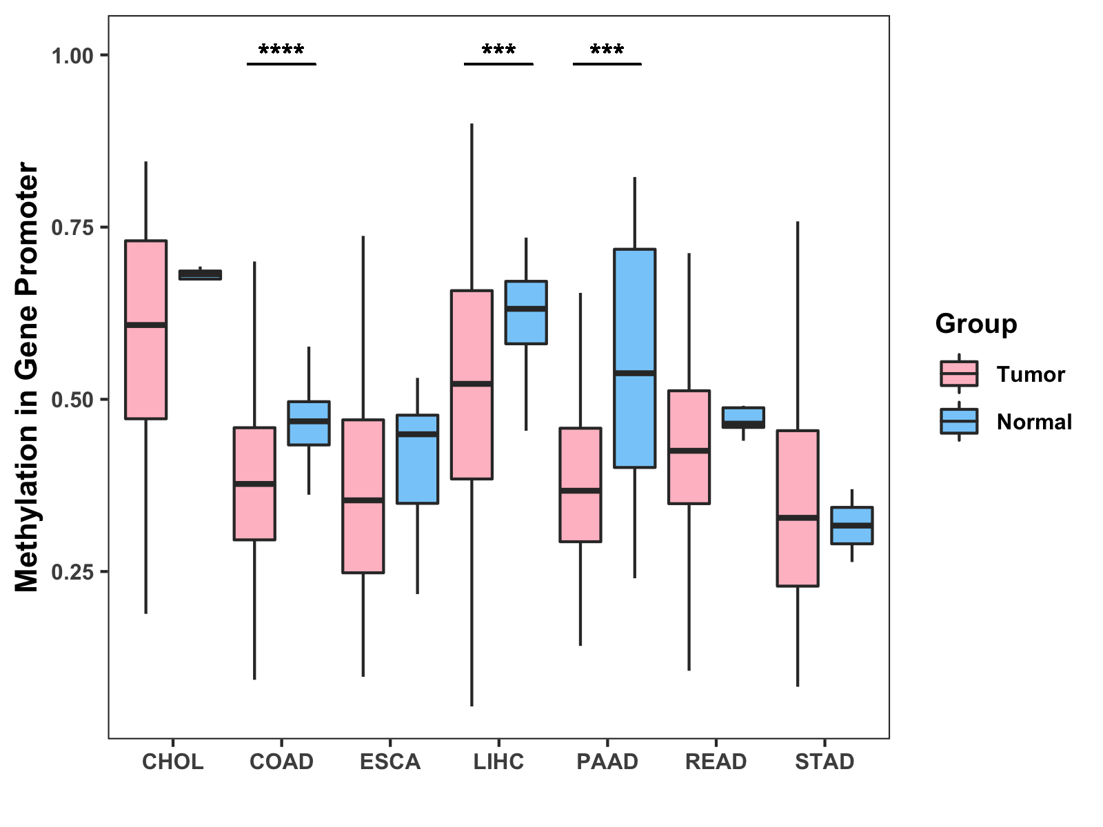 Boxplot of All Gastrointestinal Cancer ( * : 0.01-0.05 , ** : 0.005-0.01 , *** : 0.0001-0.005 , **** : < 0.0001 ) |