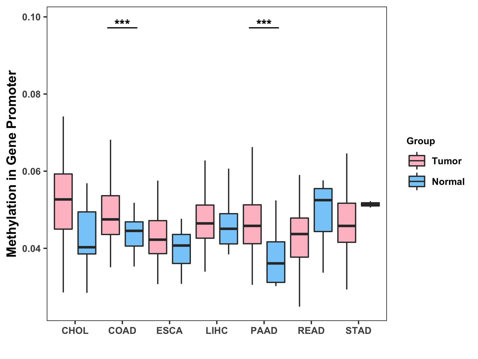 Boxplot of All Gastrointestinal Cancer ( * : 0.01-0.05 , ** : 0.005-0.01 , *** : 0.0001-0.005 , **** : < 0.0001 ) |