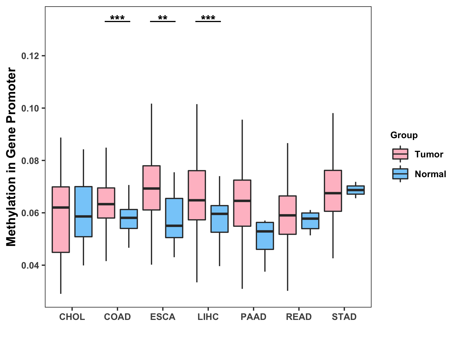 Boxplot of All Gastrointestinal Cancer ( * : 0.01-0.05 , ** : 0.005-0.01 , *** : 0.0001-0.005 , **** : < 0.0001 ) |