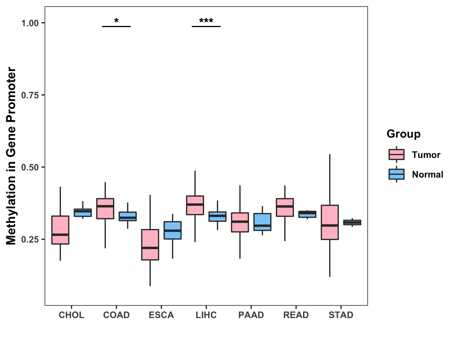 Boxplot of All Gastrointestinal Cancer ( * : 0.01-0.05 , ** : 0.005-0.01 , *** : 0.0001-0.005 , **** : < 0.0001 ) |
