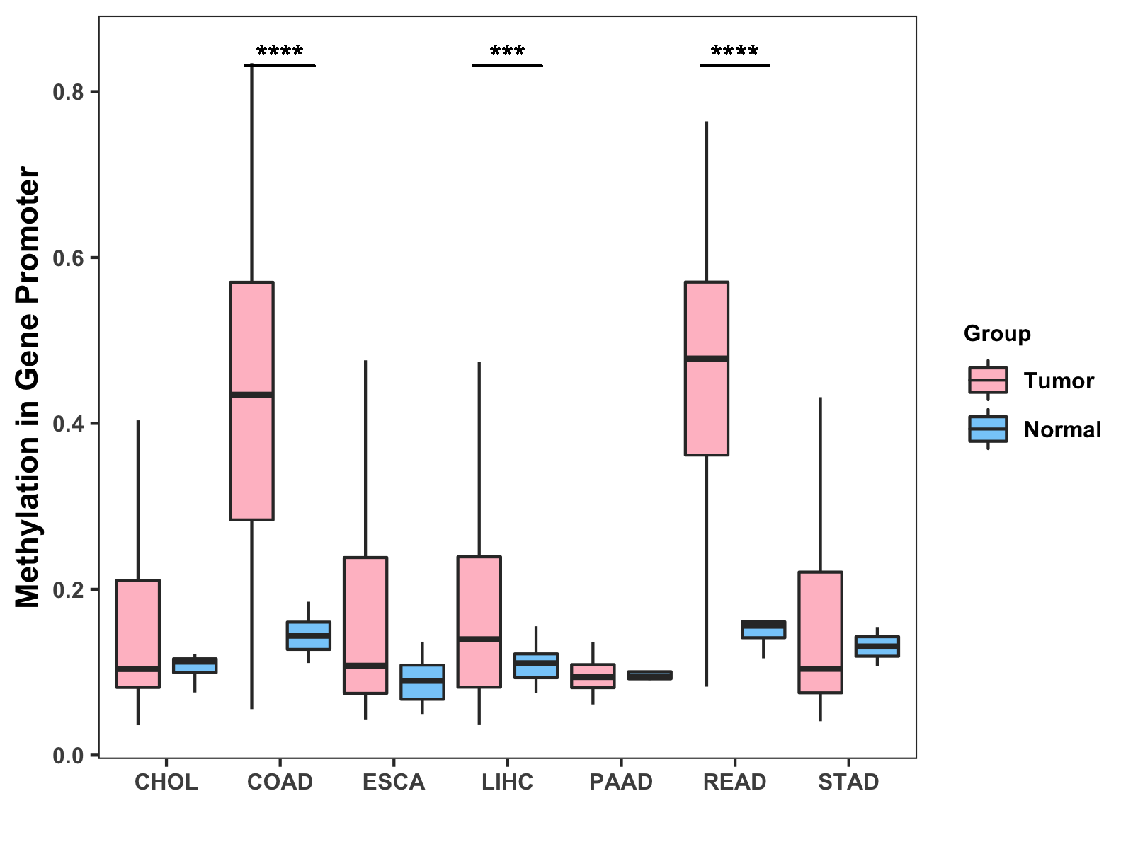 Boxplot of All Gastrointestinal Cancer ( * : 0.01-0.05 , ** : 0.005-0.01 , *** : 0.0001-0.005 , **** : < 0.0001 ) |