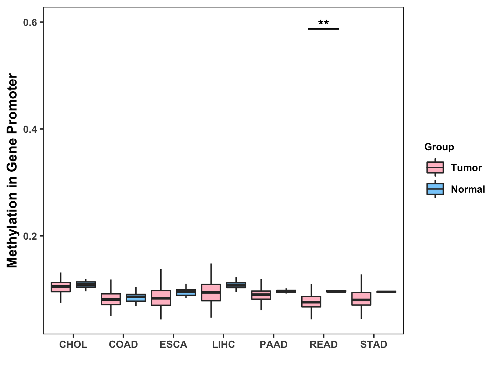 Boxplot of All Gastrointestinal Cancer ( * : 0.01-0.05 , ** : 0.005-0.01 , *** : 0.0001-0.005 , **** : < 0.0001 ) |