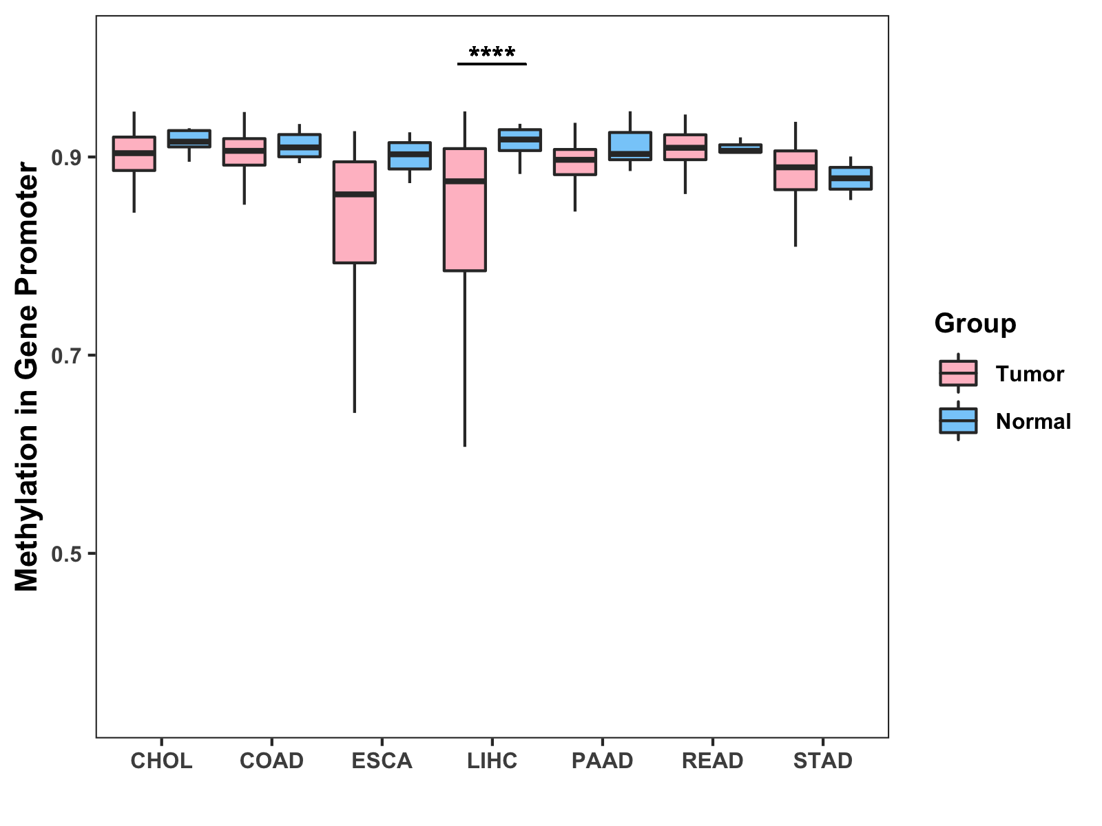 Boxplot of All Gastrointestinal Cancer ( * : 0.01-0.05 , ** : 0.005-0.01 , *** : 0.0001-0.005 , **** : < 0.0001 ) |