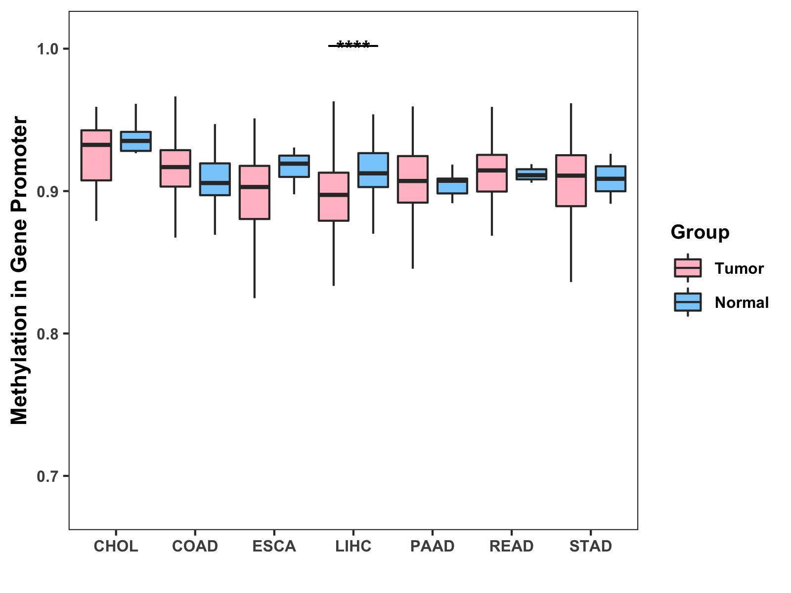 Boxplot of All Gastrointestinal Cancer ( * : 0.01-0.05 , ** : 0.005-0.01 , *** : 0.0001-0.005 , **** : < 0.0001 ) |