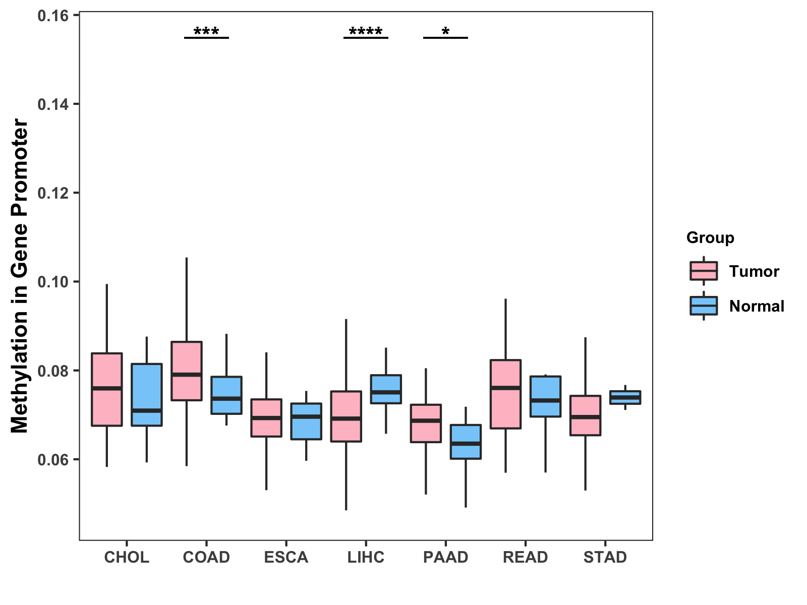 Boxplot of All Gastrointestinal Cancer ( * : 0.01-0.05 , ** : 0.005-0.01 , *** : 0.0001-0.005 , **** : < 0.0001 ) |