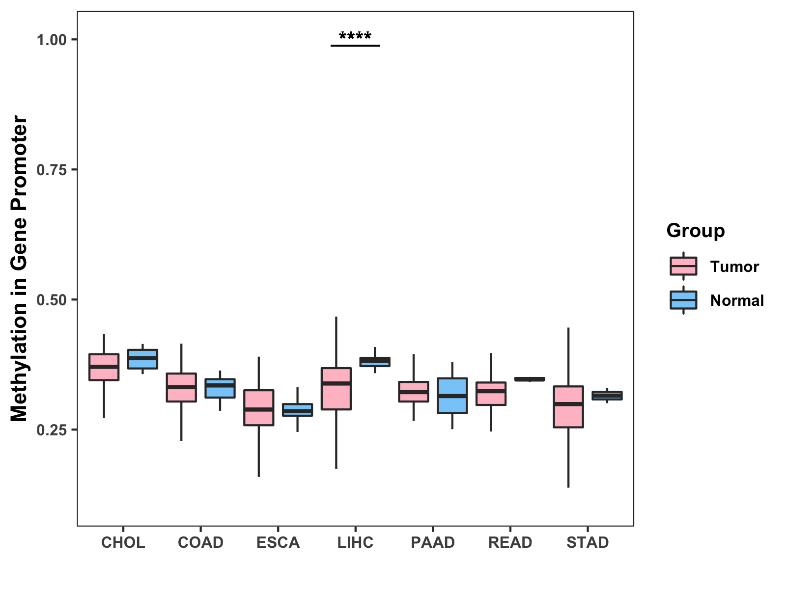 Boxplot of All Gastrointestinal Cancer ( * : 0.01-0.05 , ** : 0.005-0.01 , *** : 0.0001-0.005 , **** : < 0.0001 ) |