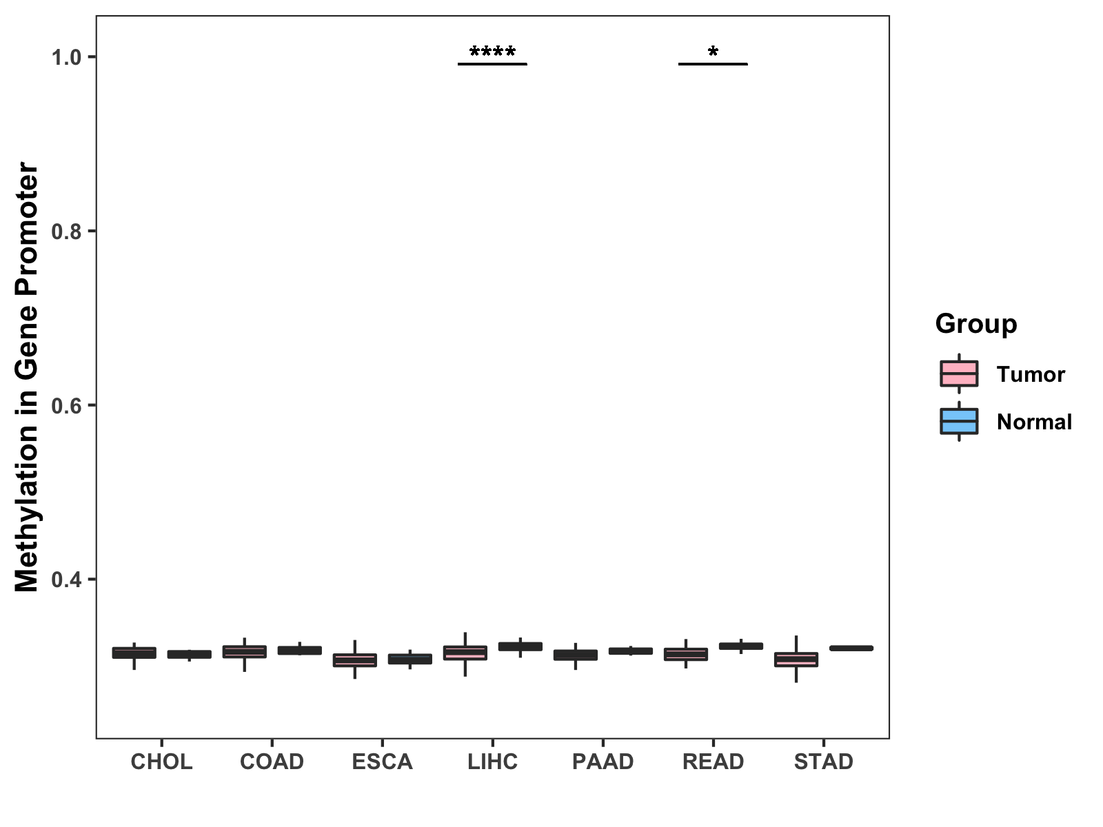Boxplot of All Gastrointestinal Cancer ( * : 0.01-0.05 , ** : 0.005-0.01 , *** : 0.0001-0.005 , **** : < 0.0001 ) |