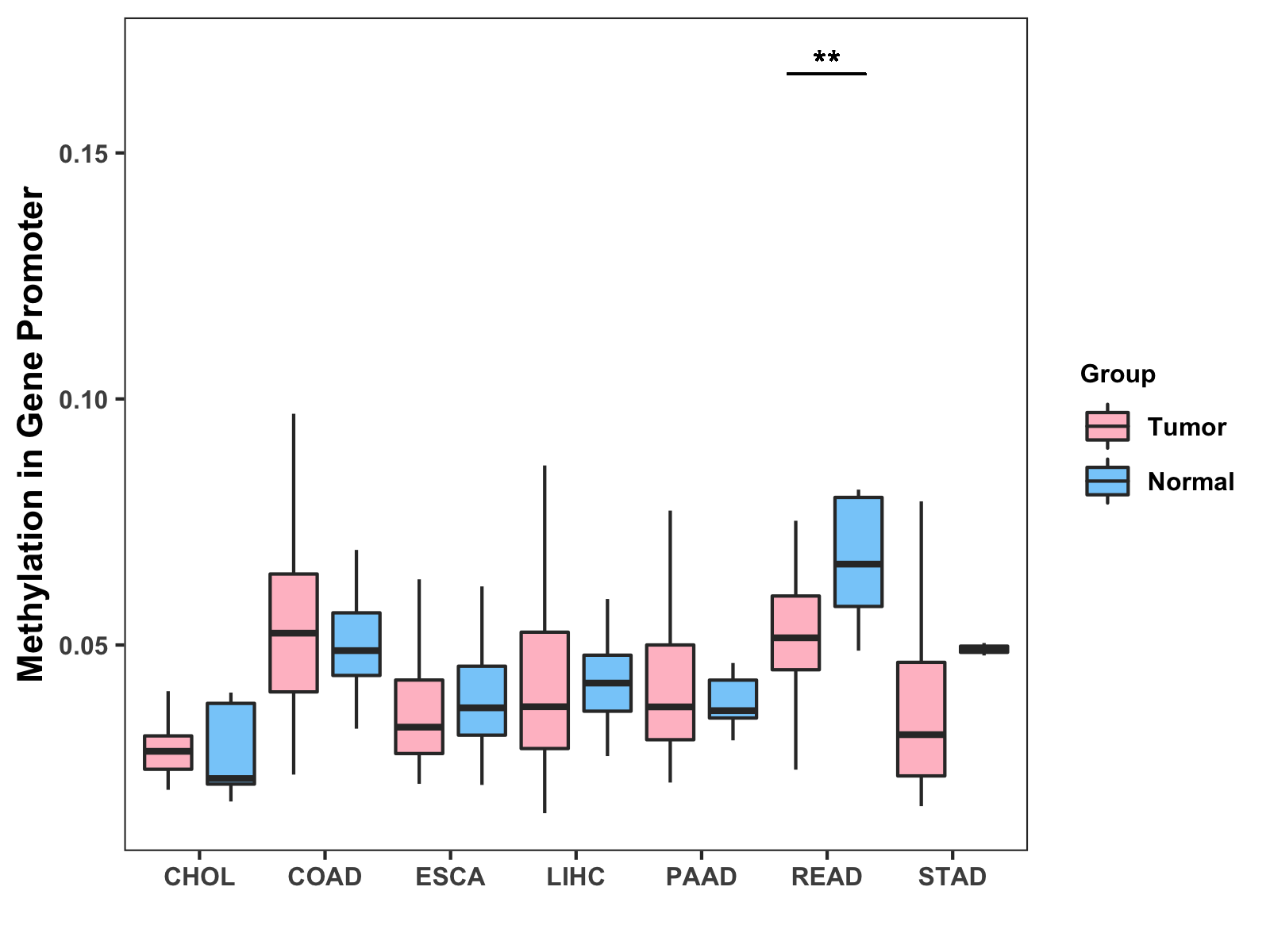 Boxplot of All Gastrointestinal Cancer ( * : 0.01-0.05 , ** : 0.005-0.01 , *** : 0.0001-0.005 , **** : < 0.0001 ) |