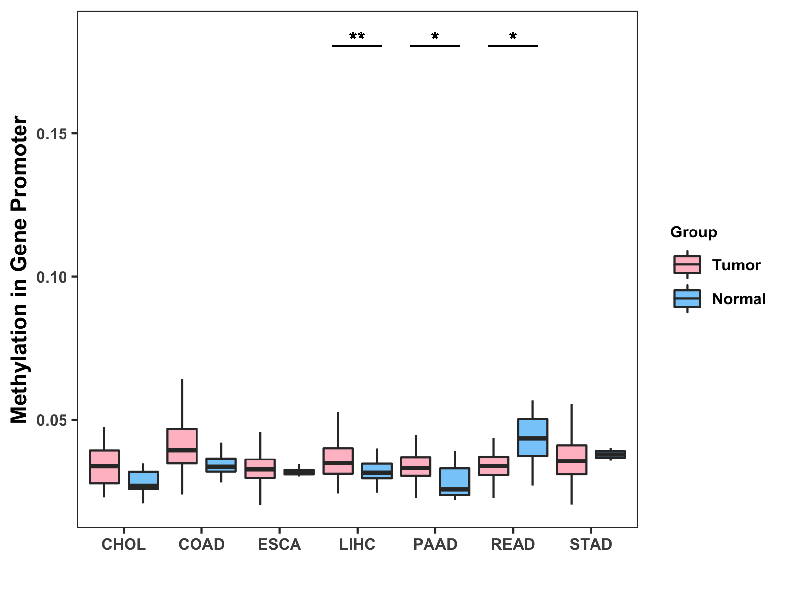 Boxplot of All Gastrointestinal Cancer ( * : 0.01-0.05 , ** : 0.005-0.01 , *** : 0.0001-0.005 , **** : < 0.0001 ) |