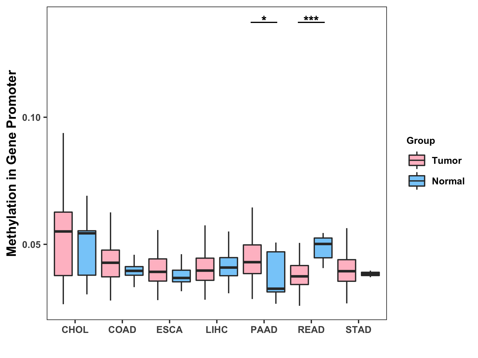 Boxplot of All Gastrointestinal Cancer ( * : 0.01-0.05 , ** : 0.005-0.01 , *** : 0.0001-0.005 , **** : < 0.0001 ) |