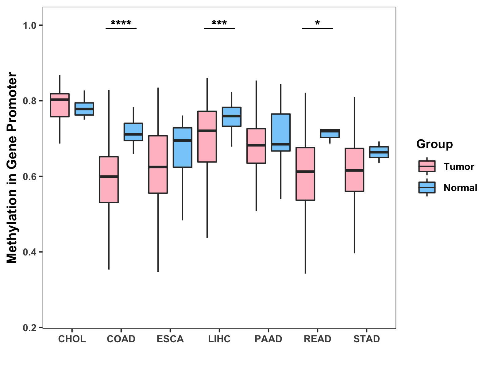 Boxplot of All Gastrointestinal Cancer ( * : 0.01-0.05 , ** : 0.005-0.01 , *** : 0.0001-0.005 , **** : < 0.0001 ) |