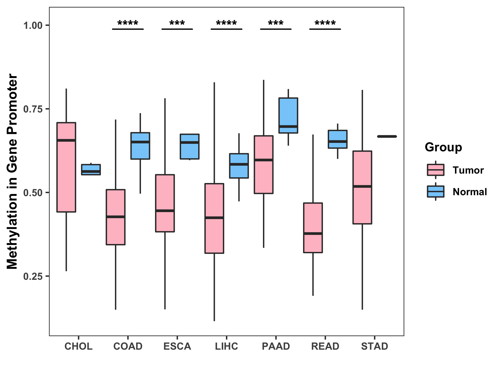 Boxplot of All Gastrointestinal Cancer ( * : 0.01-0.05 , ** : 0.005-0.01 , *** : 0.0001-0.005 , **** : < 0.0001 ) |
