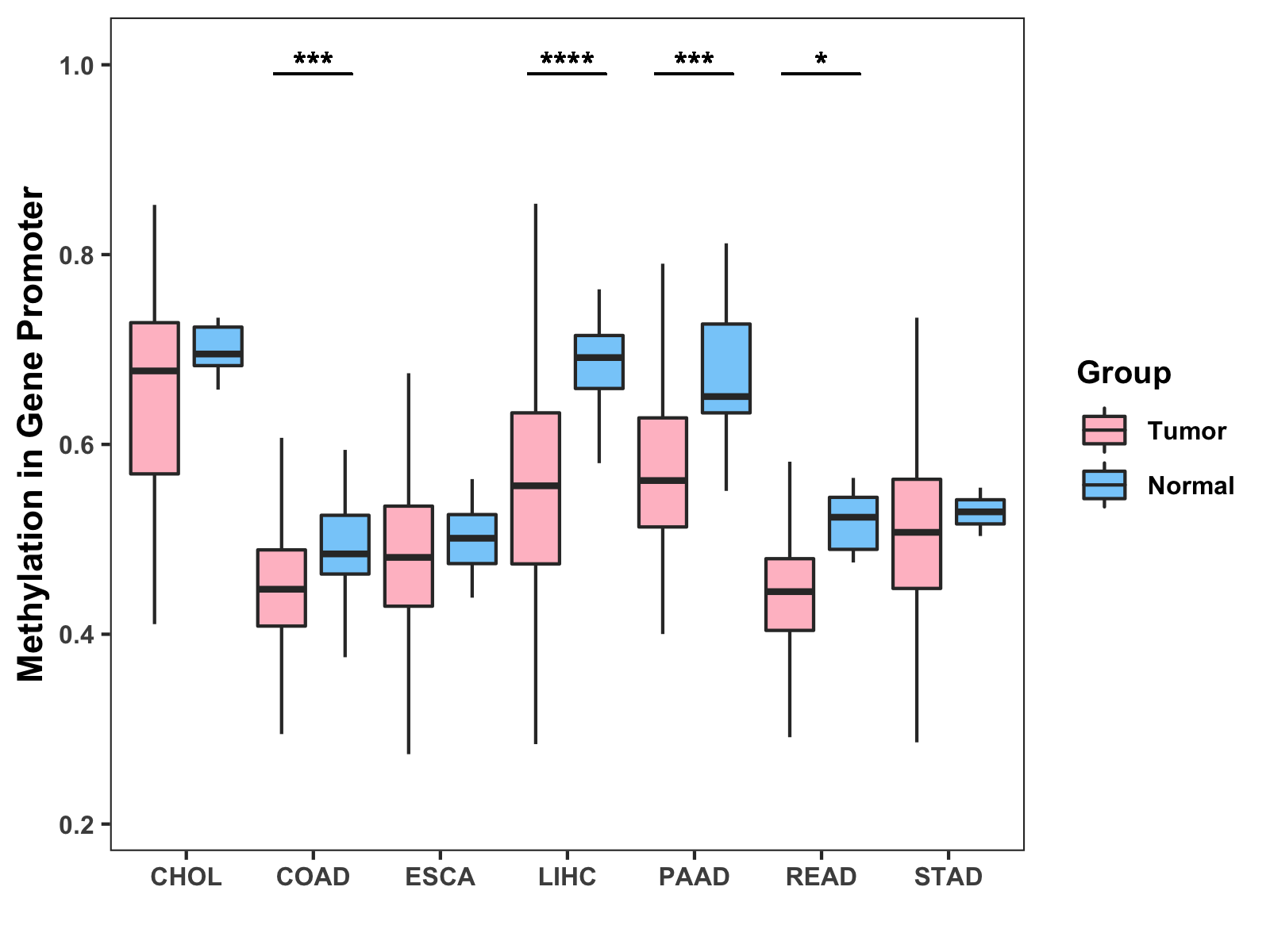 Boxplot of All Gastrointestinal Cancer ( * : 0.01-0.05 , ** : 0.005-0.01 , *** : 0.0001-0.005 , **** : < 0.0001 ) |