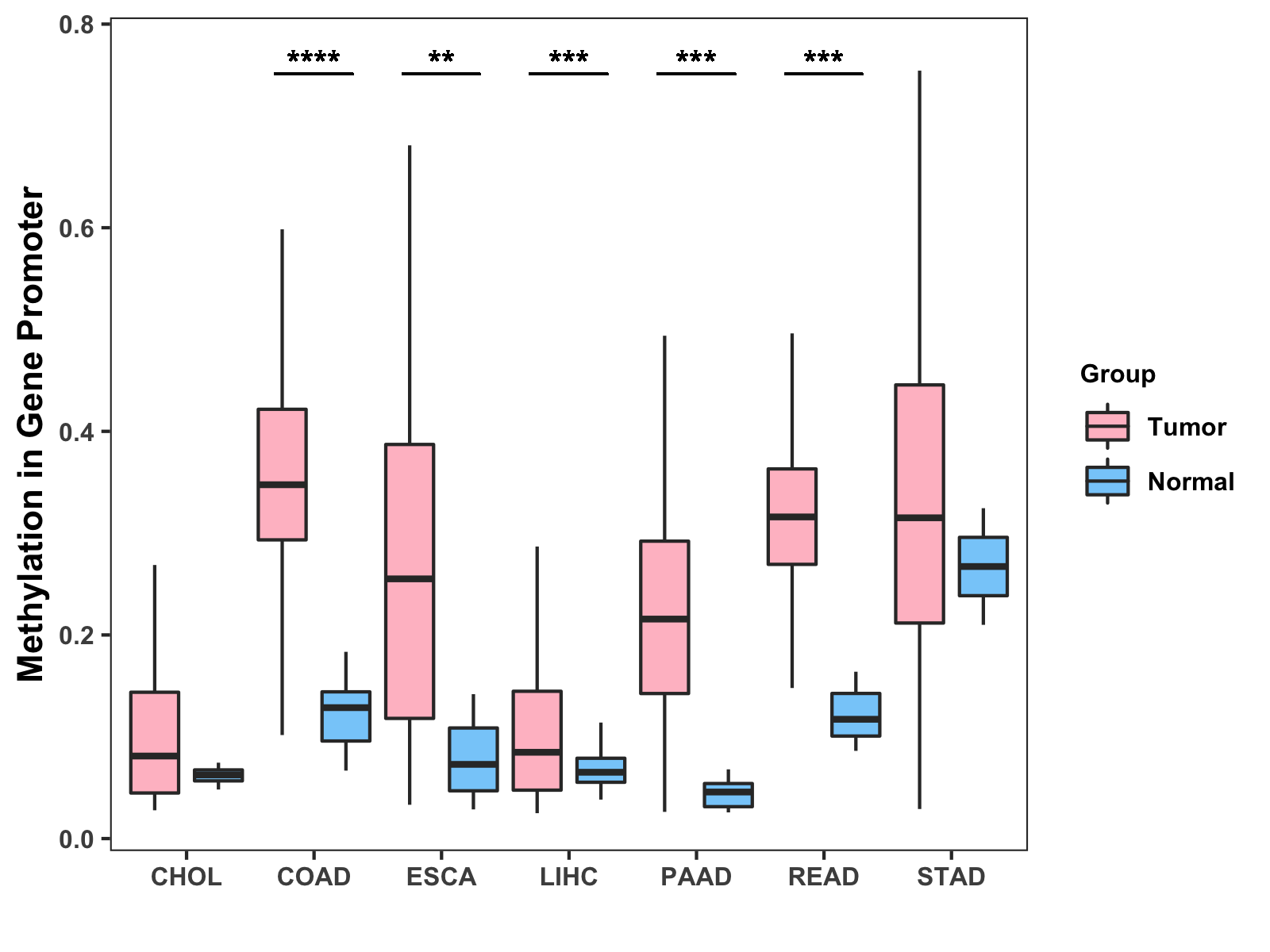 Boxplot of All Gastrointestinal Cancer ( * : 0.01-0.05 , ** : 0.005-0.01 , *** : 0.0001-0.005 , **** : < 0.0001 ) |