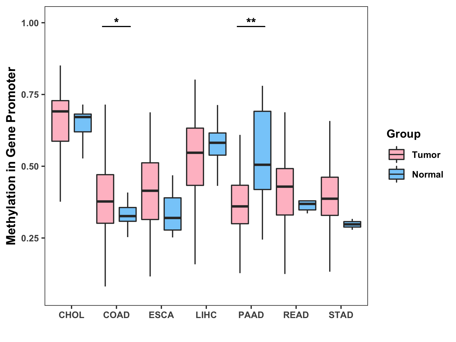 Boxplot of All Gastrointestinal Cancer ( * : 0.01-0.05 , ** : 0.005-0.01 , *** : 0.0001-0.005 , **** : < 0.0001 ) |