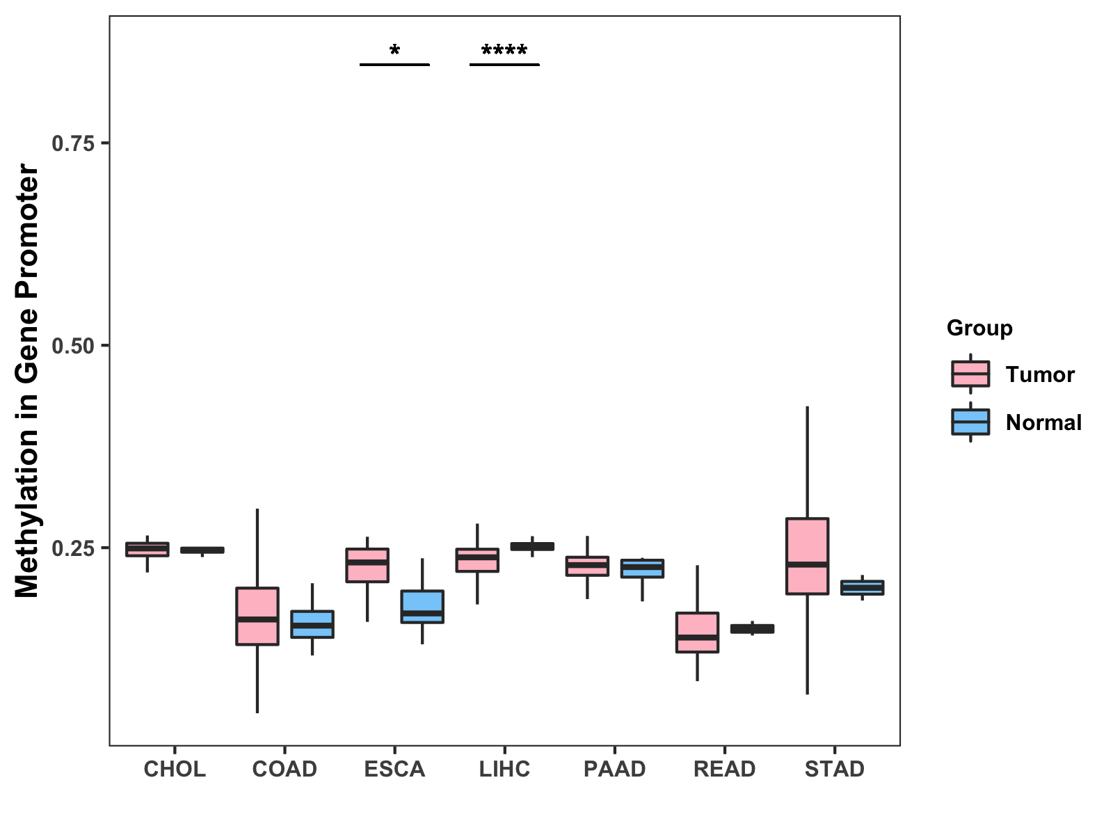 Boxplot of All Gastrointestinal Cancer ( * : 0.01-0.05 , ** : 0.005-0.01 , *** : 0.0001-0.005 , **** : < 0.0001 ) |