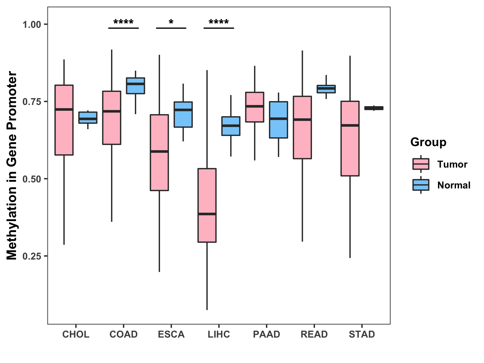 Boxplot of All Gastrointestinal Cancer ( * : 0.01-0.05 , ** : 0.005-0.01 , *** : 0.0001-0.005 , **** : < 0.0001 ) |