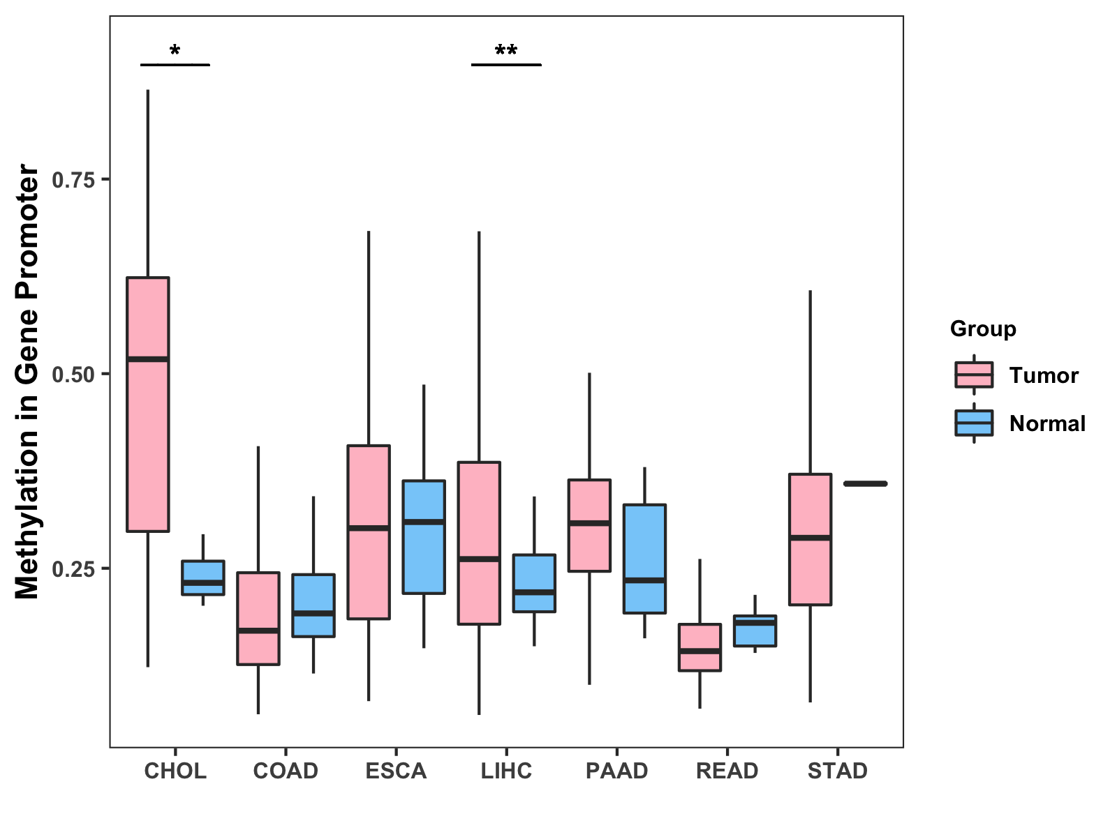 Boxplot of All Gastrointestinal Cancer ( * : 0.01-0.05 , ** : 0.005-0.01 , *** : 0.0001-0.005 , **** : < 0.0001 ) |