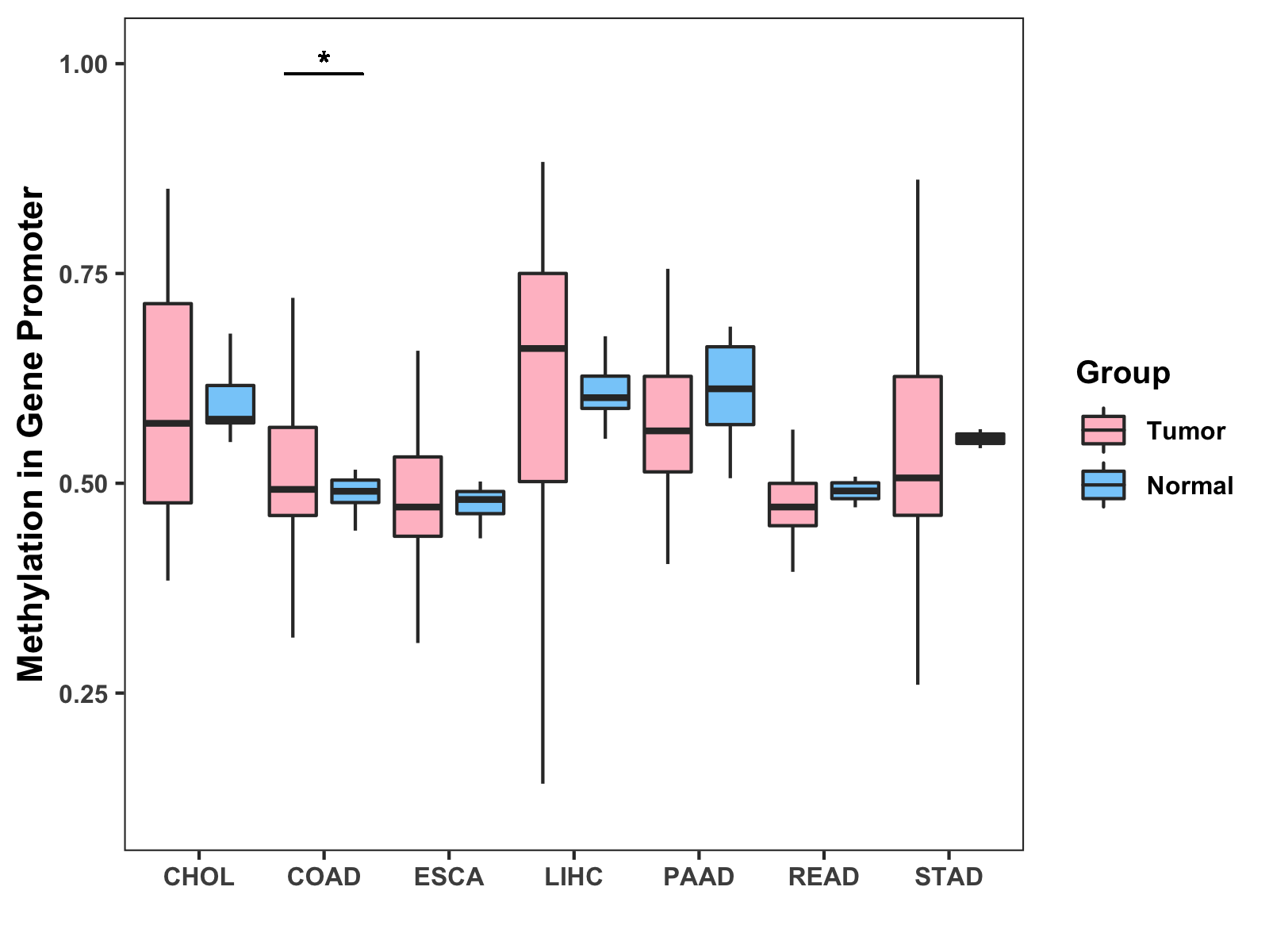 Boxplot of All Gastrointestinal Cancer ( * : 0.01-0.05 , ** : 0.005-0.01 , *** : 0.0001-0.005 , **** : < 0.0001 ) |