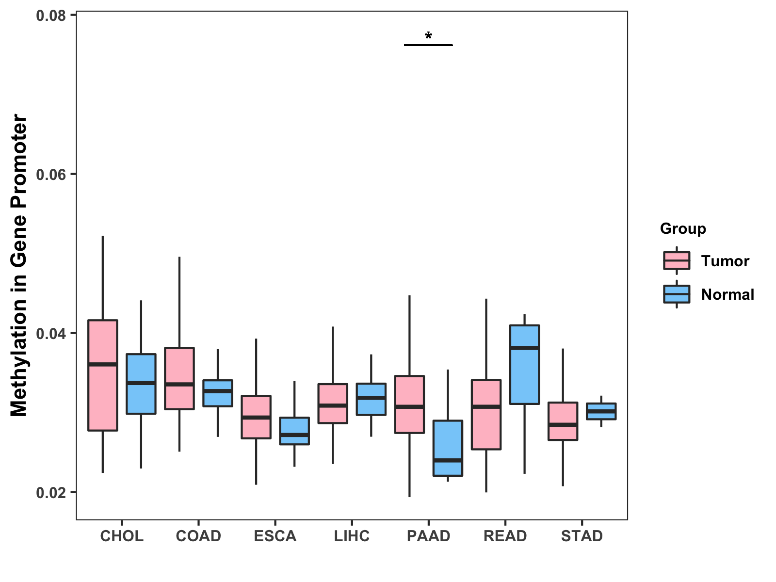 Boxplot of All Gastrointestinal Cancer ( * : 0.01-0.05 , ** : 0.005-0.01 , *** : 0.0001-0.005 , **** : < 0.0001 ) |