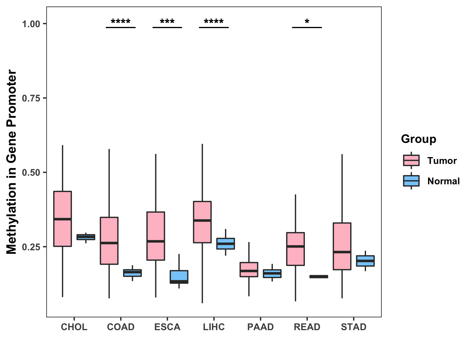 Boxplot of All Gastrointestinal Cancer ( * : 0.01-0.05 , ** : 0.005-0.01 , *** : 0.0001-0.005 , **** : < 0.0001 ) |