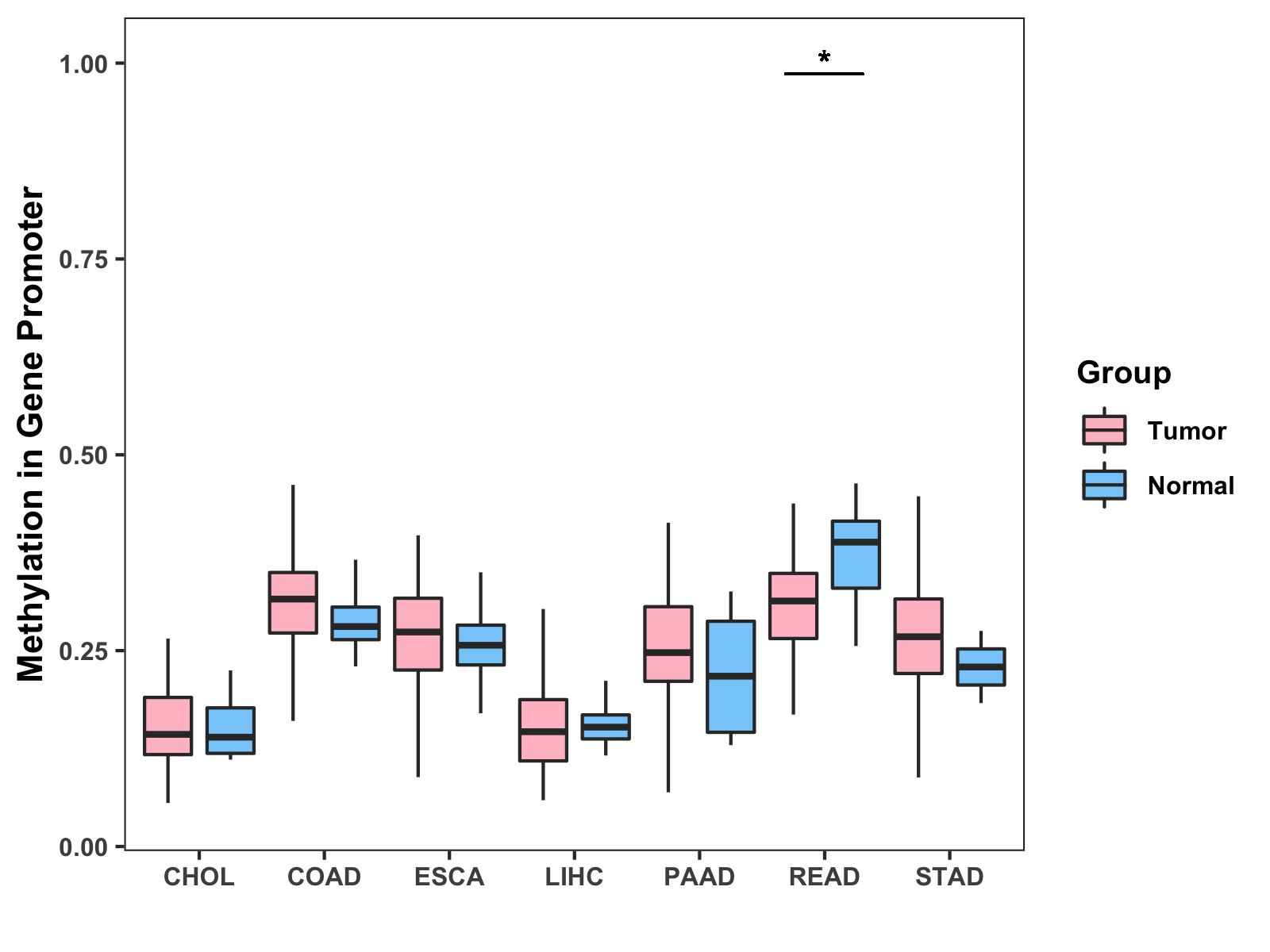 Boxplot of All Gastrointestinal Cancer ( * : 0.01-0.05 , ** : 0.005-0.01 , *** : 0.0001-0.005 , **** : < 0.0001 ) |