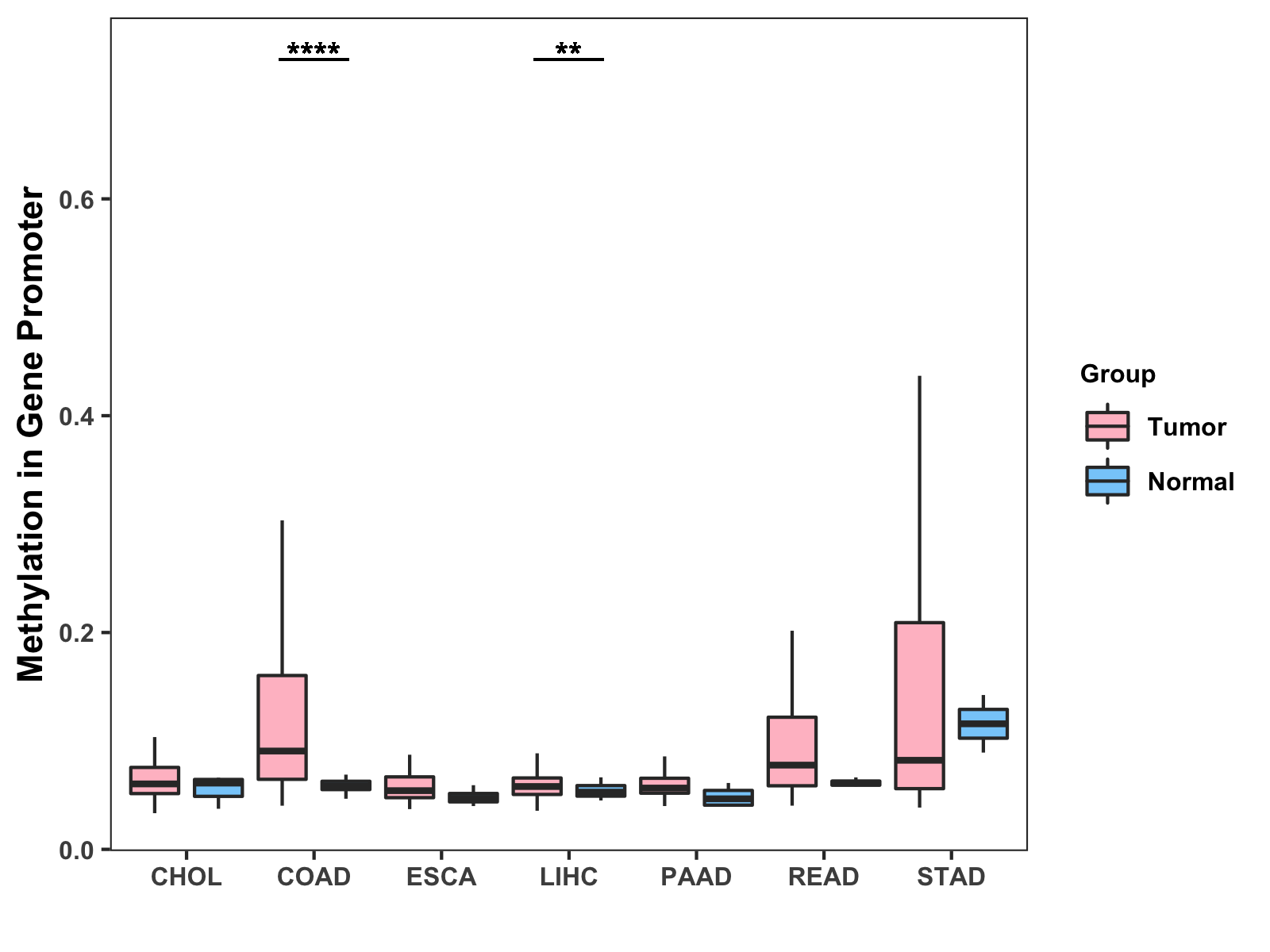 Boxplot of All Gastrointestinal Cancer ( * : 0.01-0.05 , ** : 0.005-0.01 , *** : 0.0001-0.005 , **** : < 0.0001 ) |