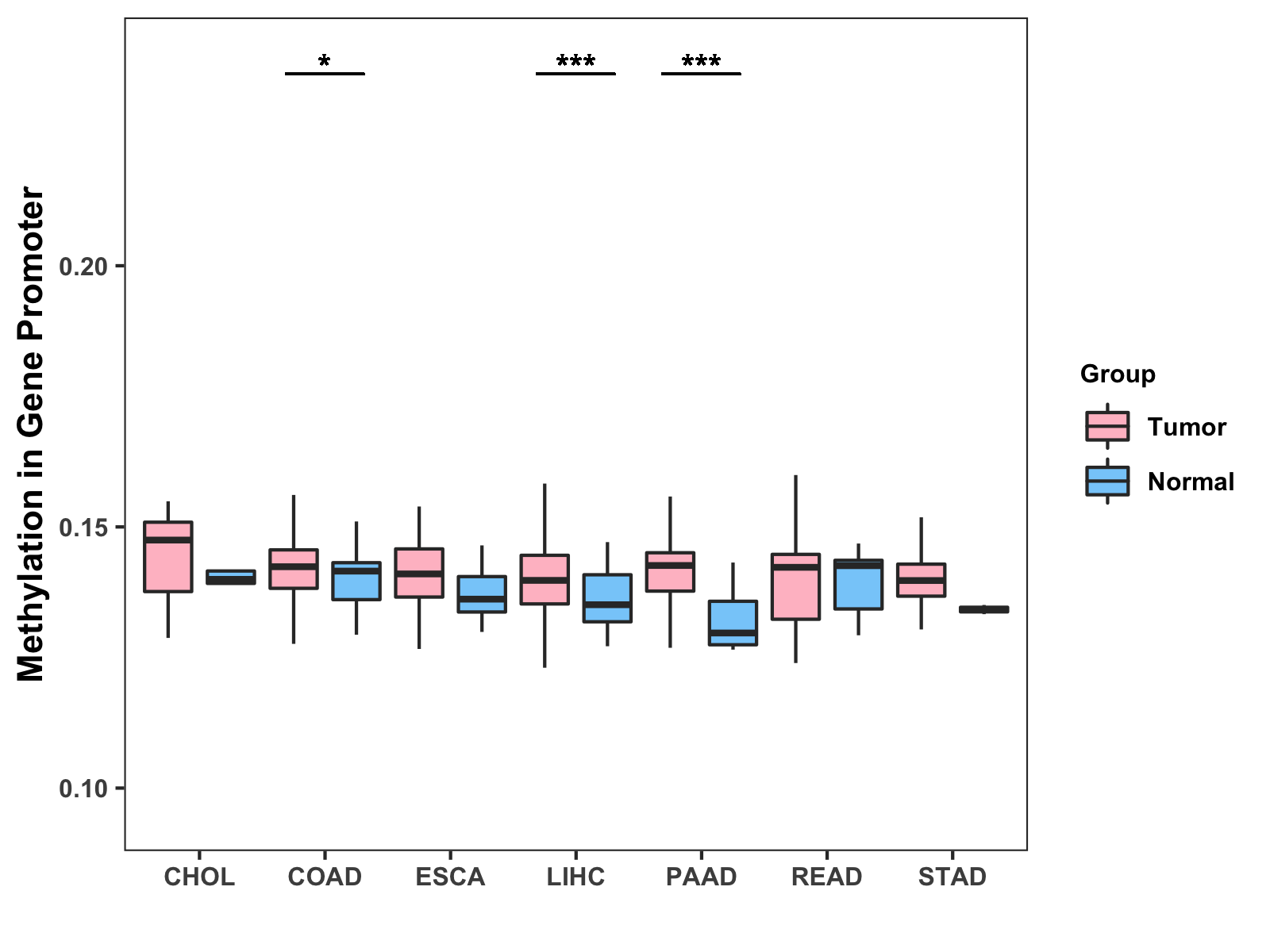 Boxplot of All Gastrointestinal Cancer ( * : 0.01-0.05 , ** : 0.005-0.01 , *** : 0.0001-0.005 , **** : < 0.0001 ) |
