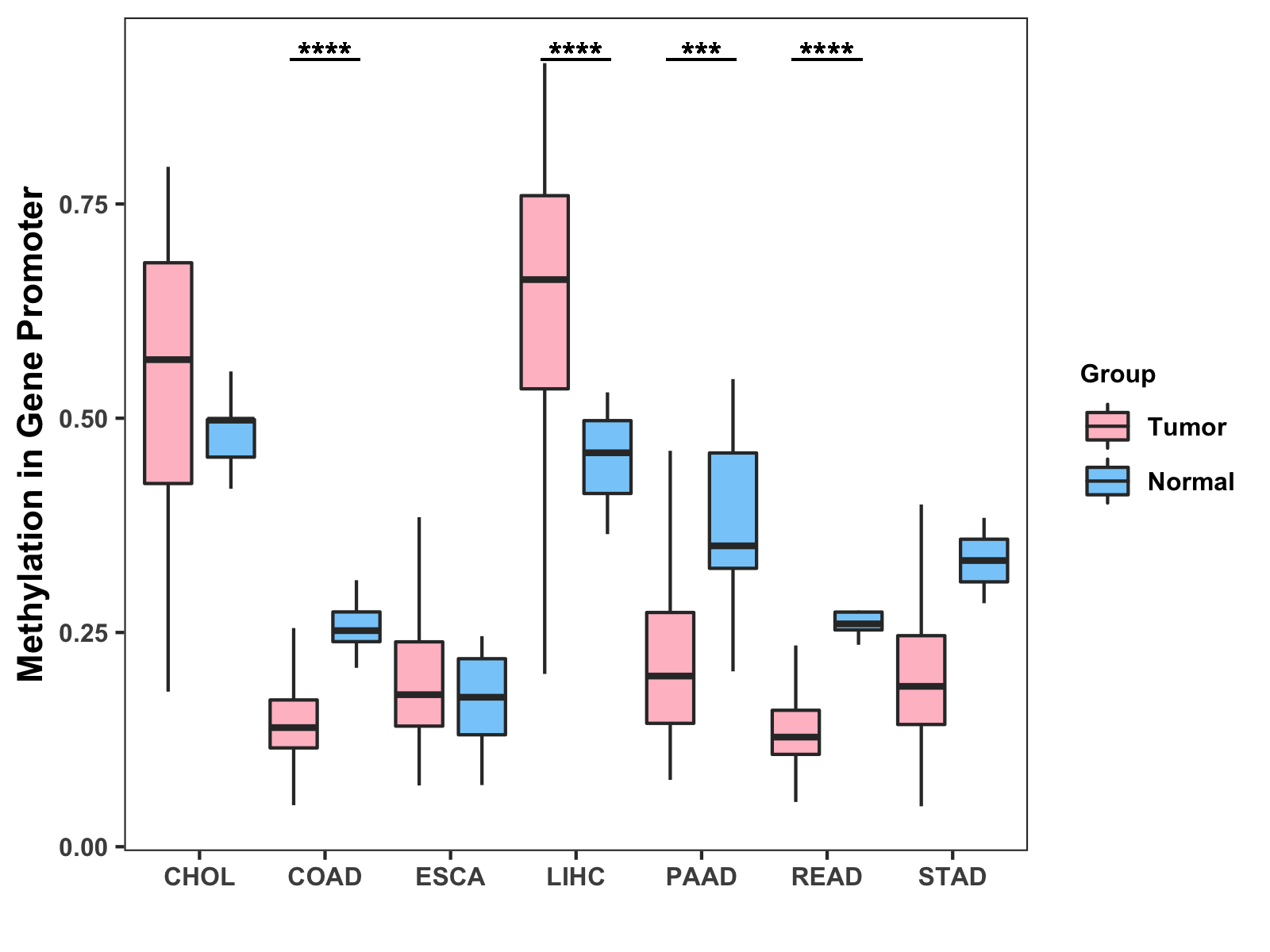 Boxplot of All Gastrointestinal Cancer ( * : 0.01-0.05 , ** : 0.005-0.01 , *** : 0.0001-0.005 , **** : < 0.0001 ) |