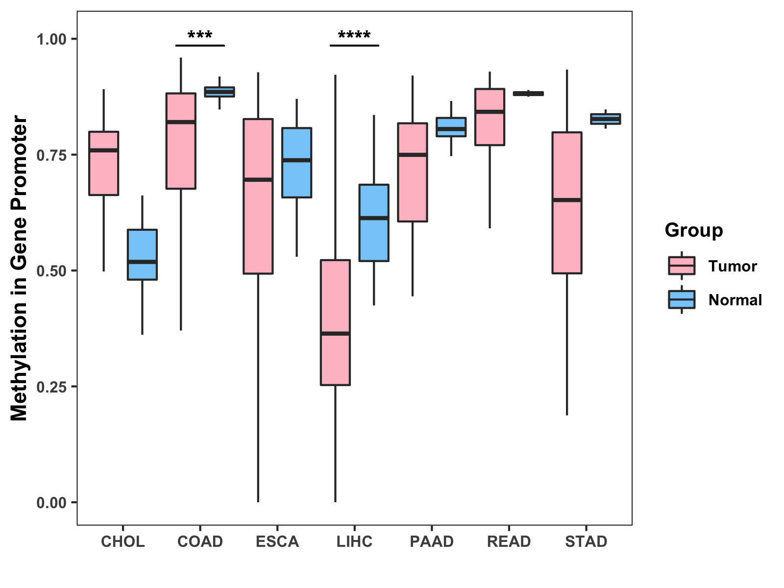 Boxplot of All Gastrointestinal Cancer ( * : 0.01-0.05 , ** : 0.005-0.01 , *** : 0.0001-0.005 , **** : < 0.0001 ) |