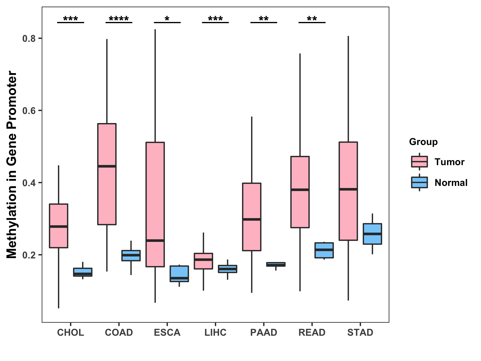 Boxplot of All Gastrointestinal Cancer ( * : 0.01-0.05 , ** : 0.005-0.01 , *** : 0.0001-0.005 , **** : < 0.0001 ) |