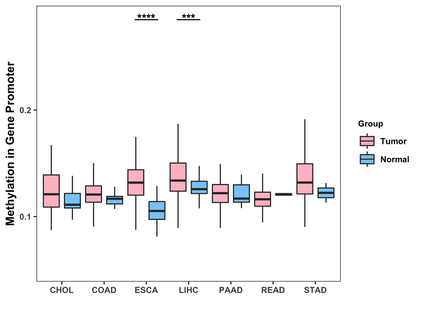 Boxplot of All Gastrointestinal Cancer ( * : 0.01-0.05 , ** : 0.005-0.01 , *** : 0.0001-0.005 , **** : < 0.0001 ) |