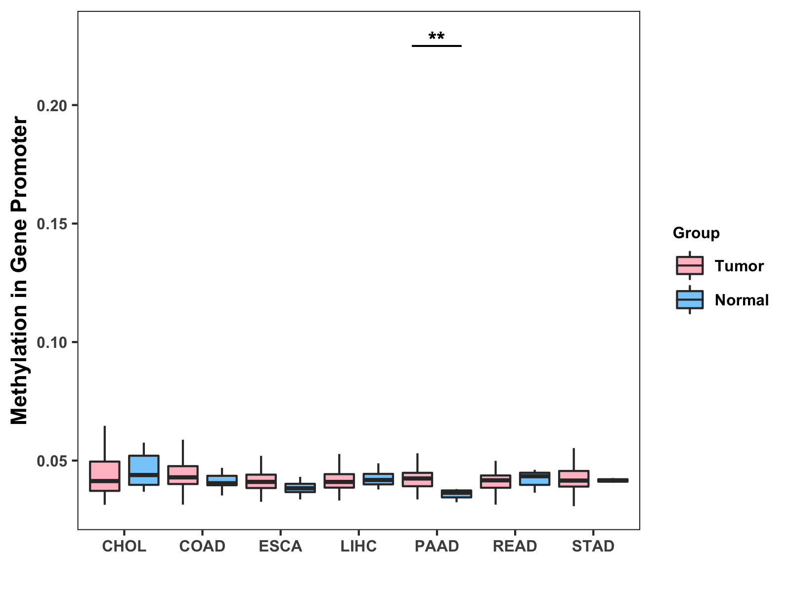 Boxplot of All Gastrointestinal Cancer ( * : 0.01-0.05 , ** : 0.005-0.01 , *** : 0.0001-0.005 , **** : < 0.0001 ) |