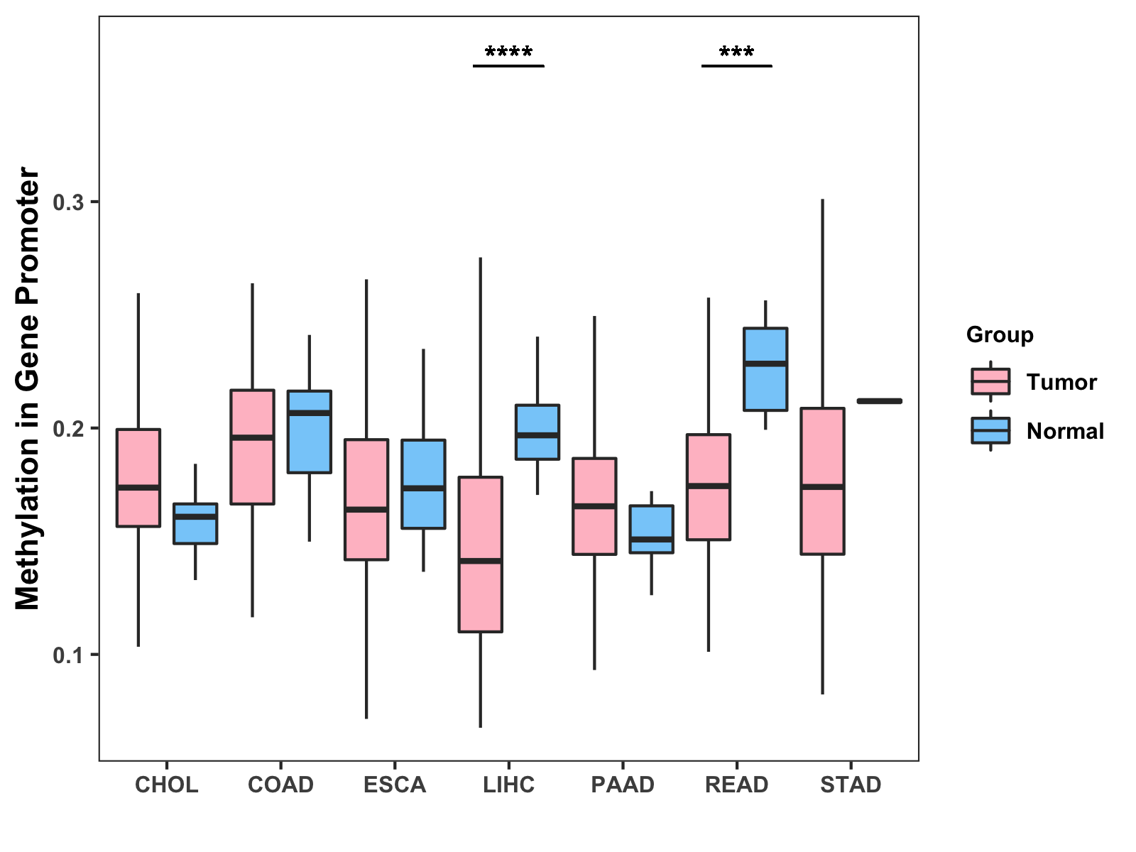 Boxplot of All Gastrointestinal Cancer ( * : 0.01-0.05 , ** : 0.005-0.01 , *** : 0.0001-0.005 , **** : < 0.0001 ) |