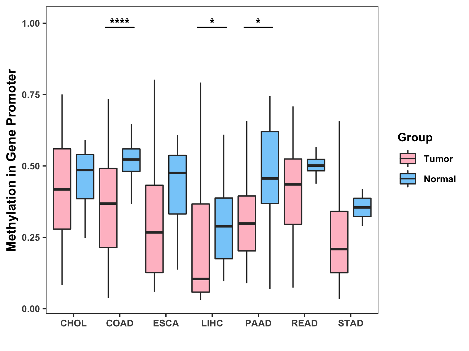 Boxplot of All Gastrointestinal Cancer ( * : 0.01-0.05 , ** : 0.005-0.01 , *** : 0.0001-0.005 , **** : < 0.0001 ) |