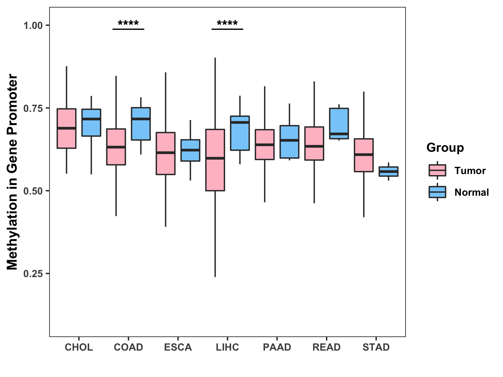 Boxplot of All Gastrointestinal Cancer ( * : 0.01-0.05 , ** : 0.005-0.01 , *** : 0.0001-0.005 , **** : < 0.0001 ) |