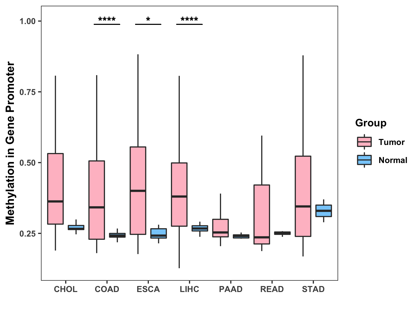 Boxplot of All Gastrointestinal Cancer ( * : 0.01-0.05 , ** : 0.005-0.01 , *** : 0.0001-0.005 , **** : < 0.0001 ) |
