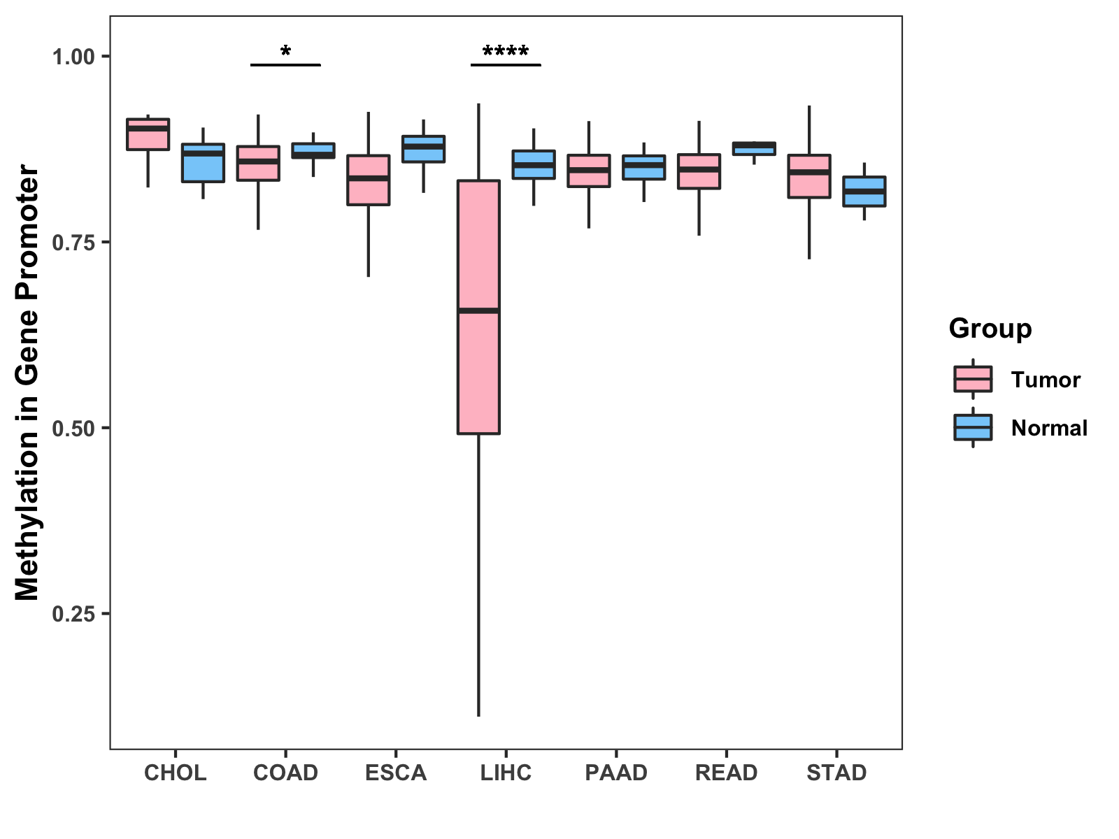 Boxplot of All Gastrointestinal Cancer ( * : 0.01-0.05 , ** : 0.005-0.01 , *** : 0.0001-0.005 , **** : < 0.0001 ) |