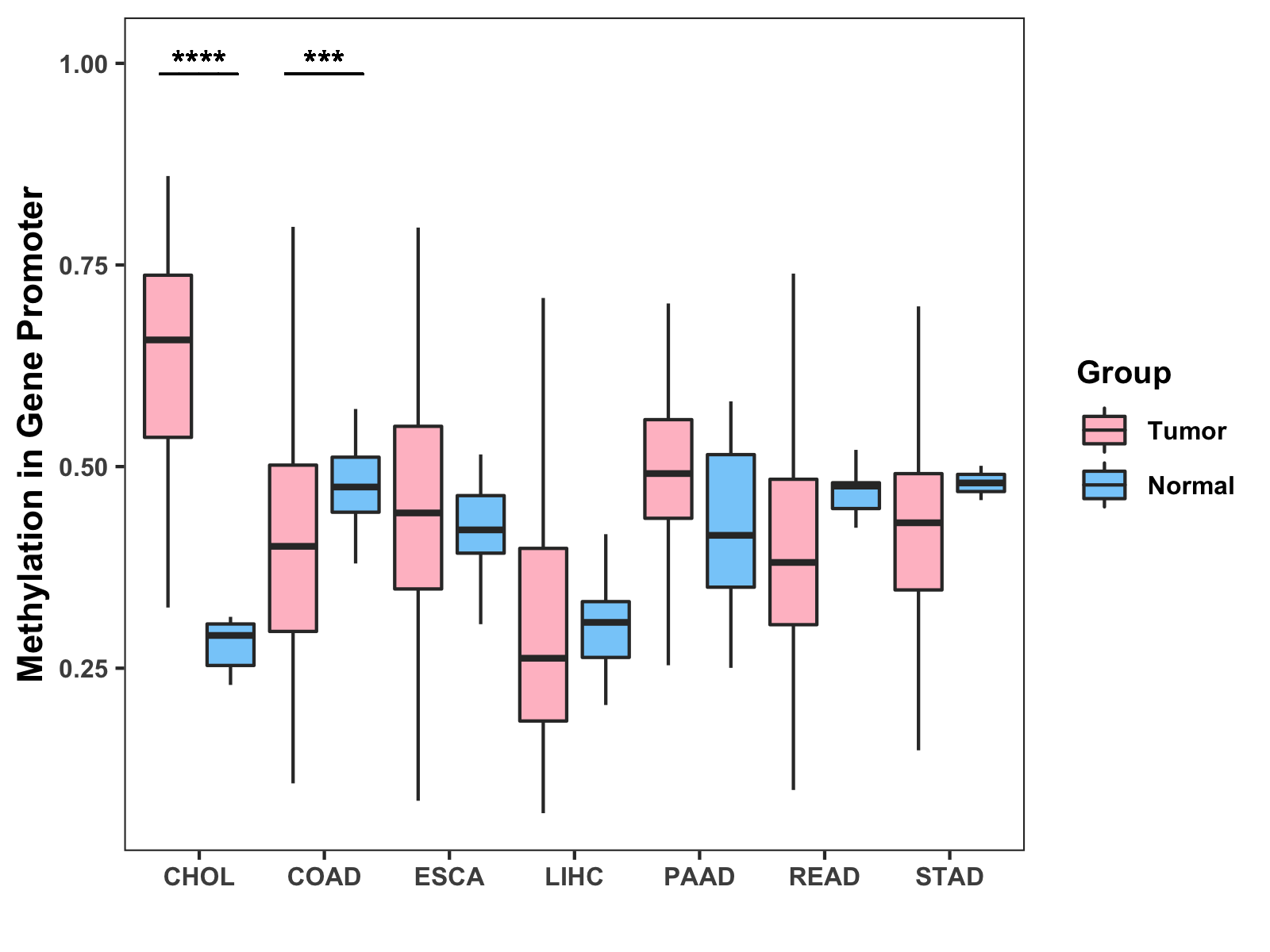 Boxplot of All Gastrointestinal Cancer ( * : 0.01-0.05 , ** : 0.005-0.01 , *** : 0.0001-0.005 , **** : < 0.0001 ) |