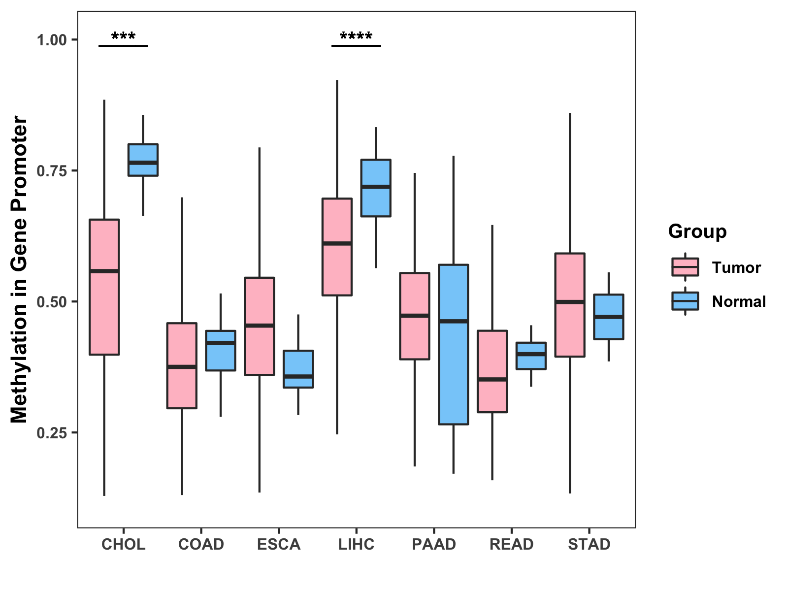 Boxplot of All Gastrointestinal Cancer ( * : 0.01-0.05 , ** : 0.005-0.01 , *** : 0.0001-0.005 , **** : < 0.0001 ) |