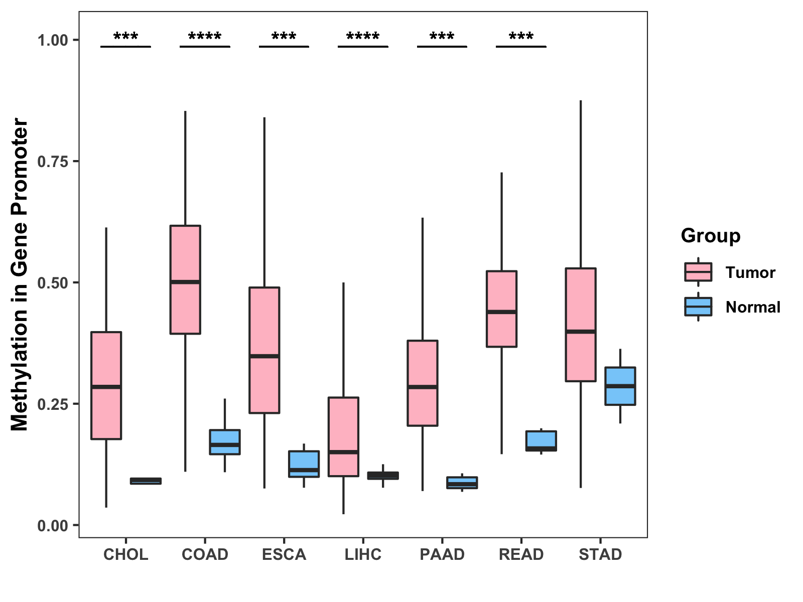 Boxplot of All Gastrointestinal Cancer ( * : 0.01-0.05 , ** : 0.005-0.01 , *** : 0.0001-0.005 , **** : < 0.0001 ) |