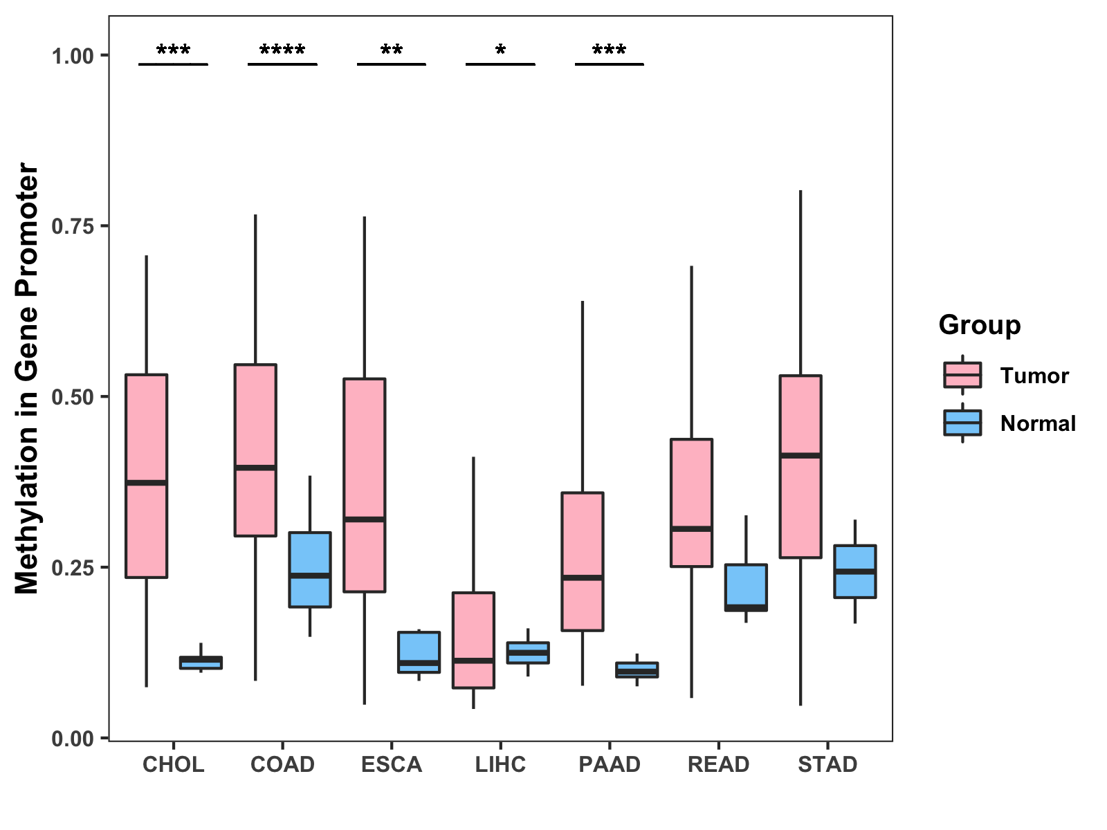 Boxplot of All Gastrointestinal Cancer ( * : 0.01-0.05 , ** : 0.005-0.01 , *** : 0.0001-0.005 , **** : < 0.0001 ) |
