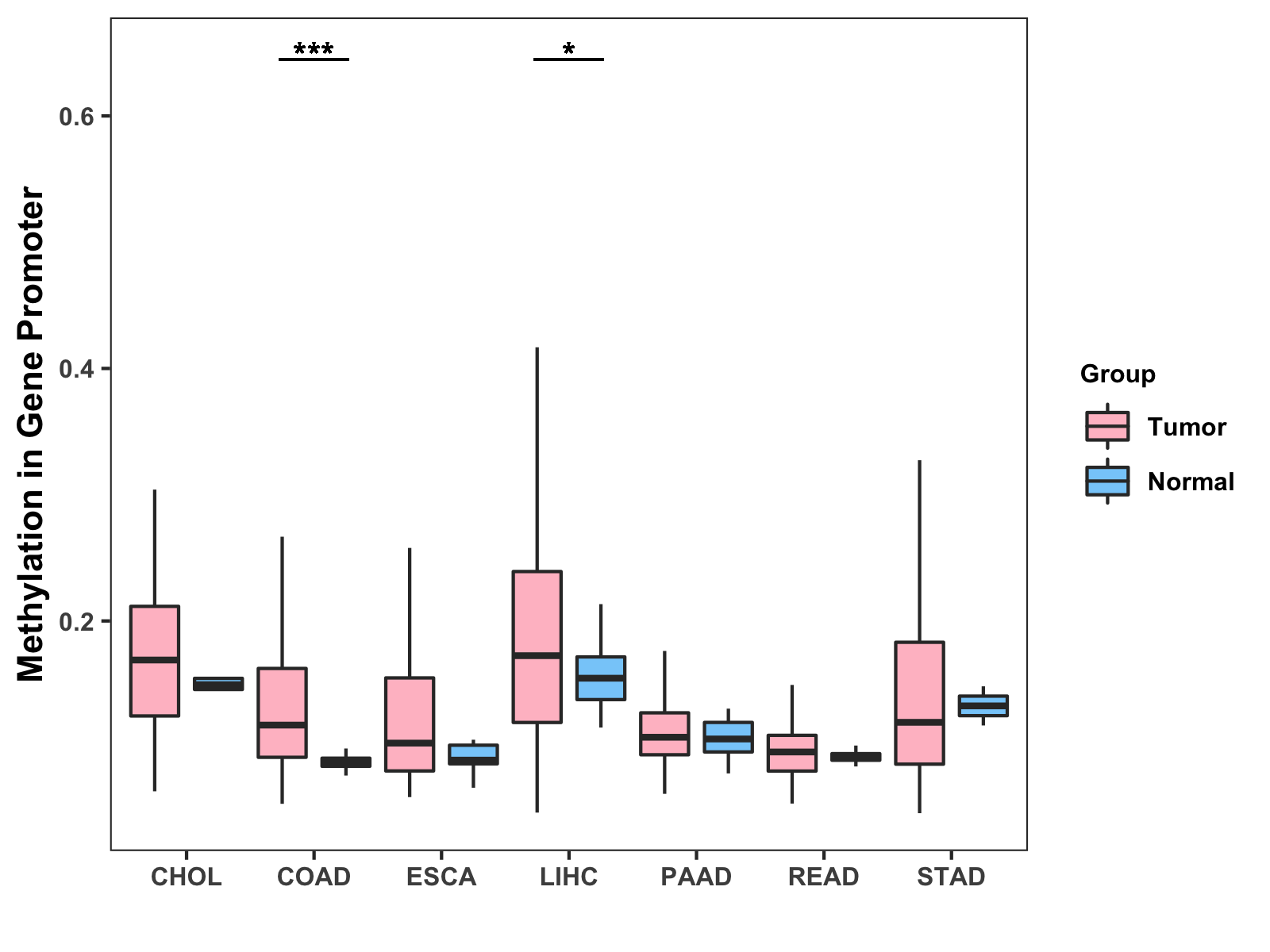 Boxplot of All Gastrointestinal Cancer ( * : 0.01-0.05 , ** : 0.005-0.01 , *** : 0.0001-0.005 , **** : < 0.0001 ) |