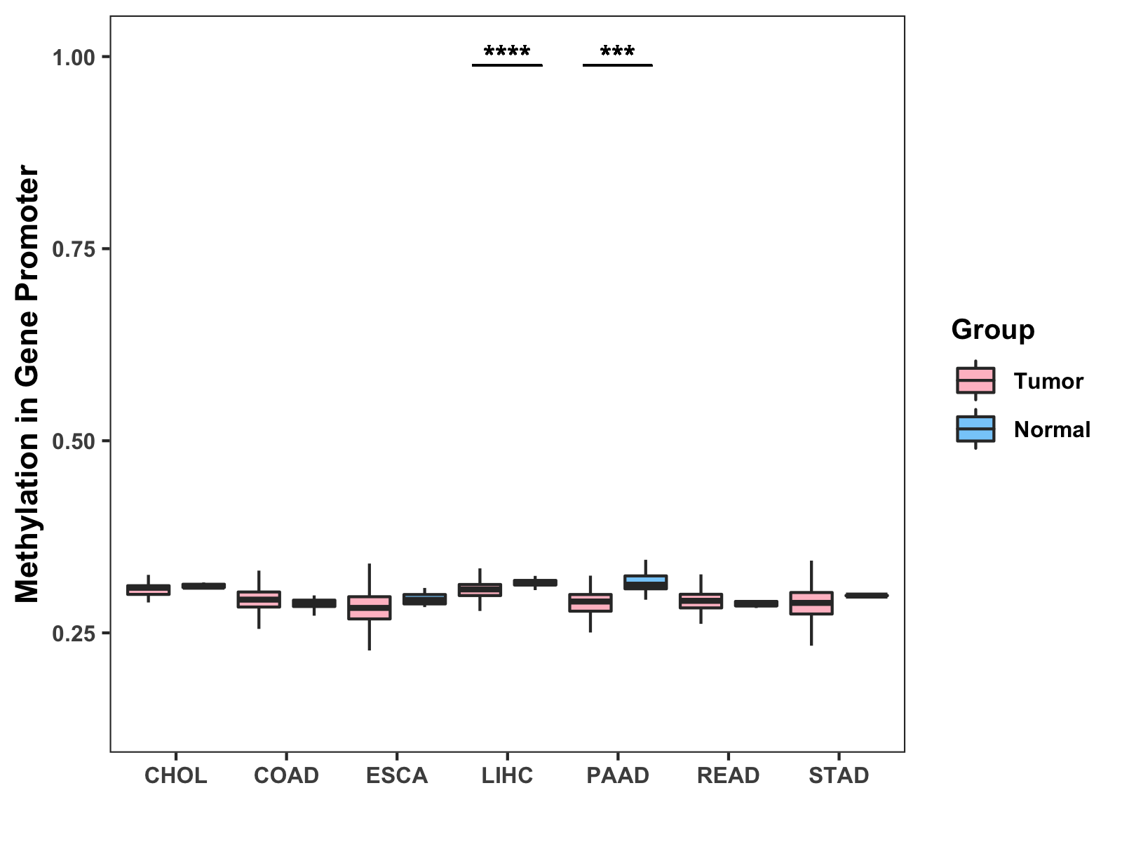 Boxplot of All Gastrointestinal Cancer ( * : 0.01-0.05 , ** : 0.005-0.01 , *** : 0.0001-0.005 , **** : < 0.0001 ) |