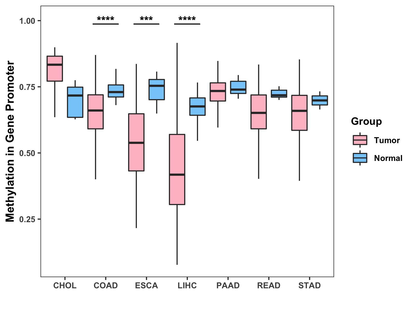 Boxplot of All Gastrointestinal Cancer ( * : 0.01-0.05 , ** : 0.005-0.01 , *** : 0.0001-0.005 , **** : < 0.0001 ) |