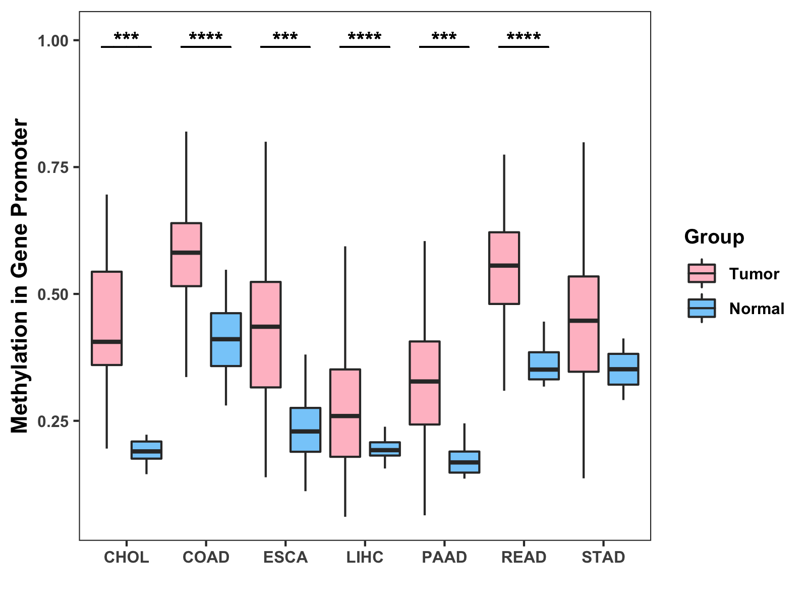 Boxplot of All Gastrointestinal Cancer ( * : 0.01-0.05 , ** : 0.005-0.01 , *** : 0.0001-0.005 , **** : < 0.0001 ) |