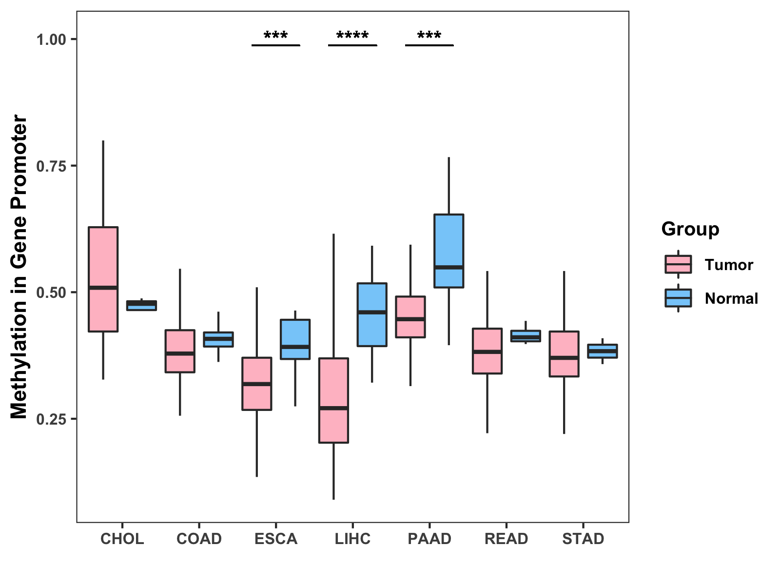 Boxplot of All Gastrointestinal Cancer ( * : 0.01-0.05 , ** : 0.005-0.01 , *** : 0.0001-0.005 , **** : < 0.0001 ) |