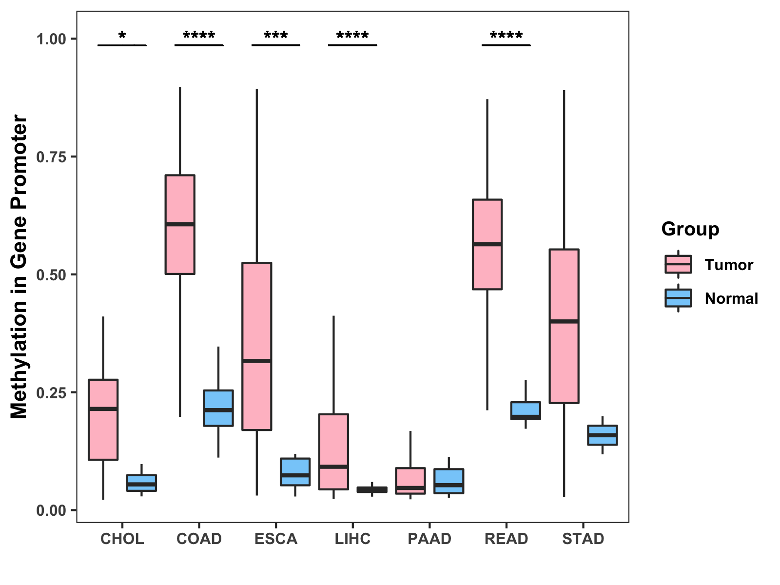 Boxplot of All Gastrointestinal Cancer ( * : 0.01-0.05 , ** : 0.005-0.01 , *** : 0.0001-0.005 , **** : < 0.0001 ) |